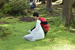 広大な敷地を手分けし、落ち葉拾いや草取りなどを実施しました。